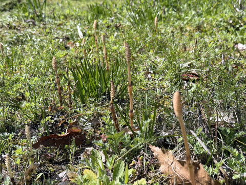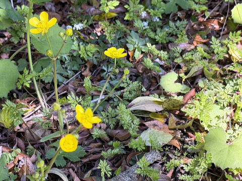 風を受け畦に群れ咲くたんぽぽ黄 水の音